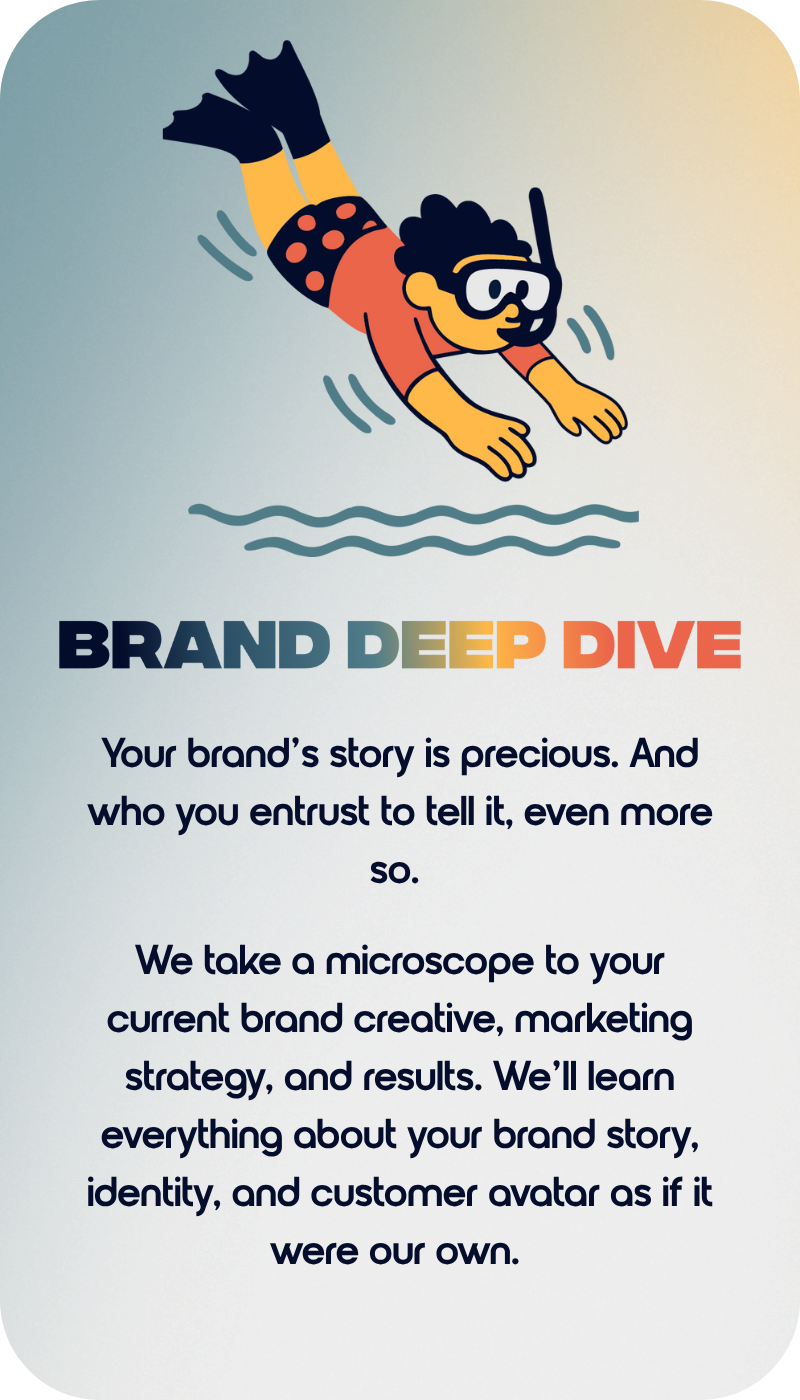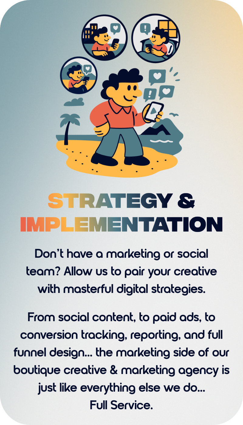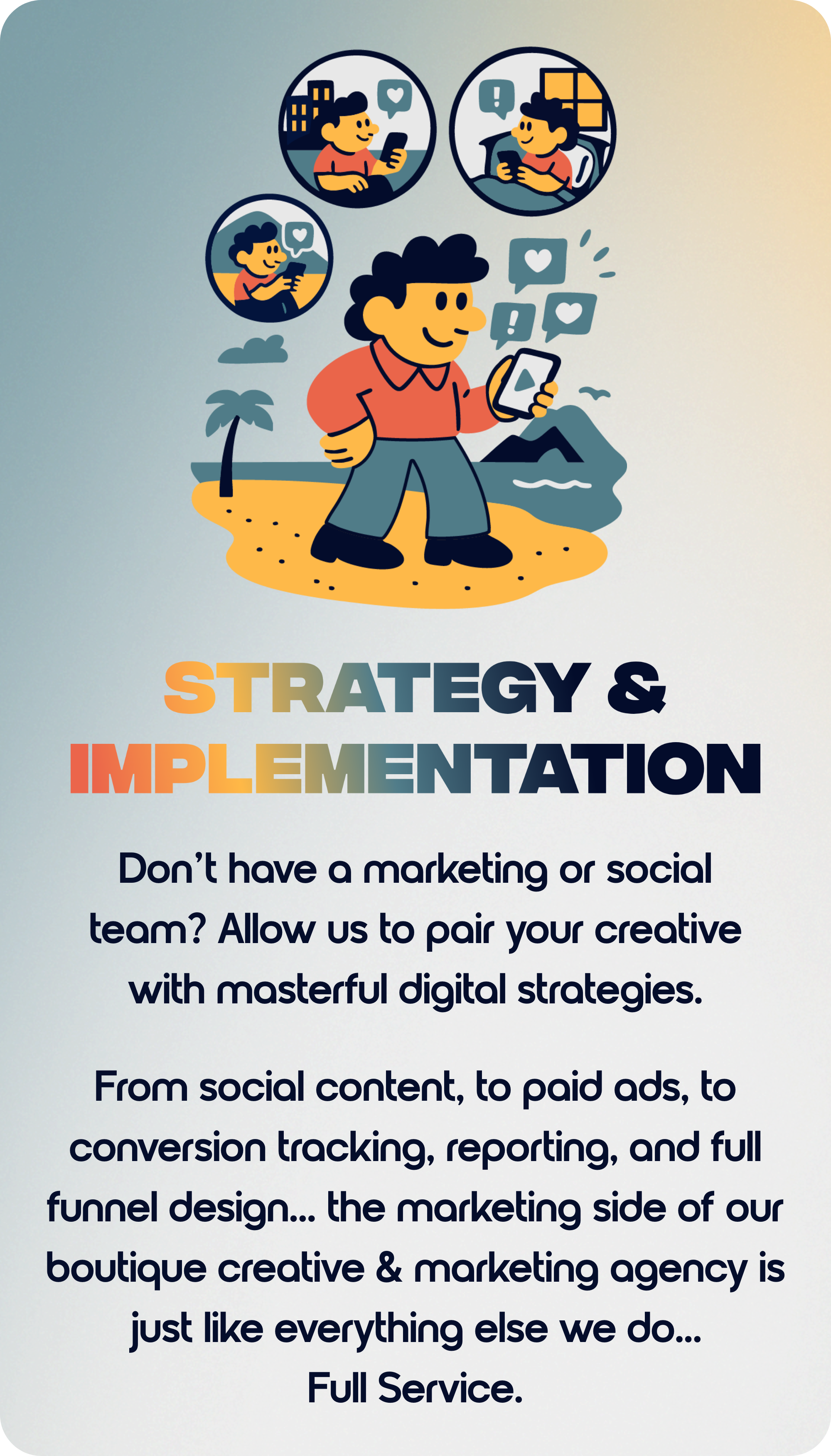 Our sweet spot is in ideation and marketing strategies purposefully composed for just your brand rather than cookie-cutter formulas. Identifying new ways to make your brand captivate, connect, and convert is our bread and butter. You plan for your brand’s future, we’ll write the story.